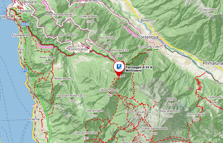 PARKOVIŠTĚ VO' DI MONCODENO se nachází nad obcí Esino Lario 30 minut jízdy autem od našeho apartmánu. Je ideálním výchozím místem pro túry po okolních horách. Lehčí turistickou trasou jsou výšlapy na vrcholy Monte Palestro nebo Monte Crocce, odkud se otevírá úžasný výhled na jezero, stejně jako od jedinečného skalního útvaru Porta di Prada, vysokého 20 metrů, který po tisíciletí tvarovala eroze. Lehké turistické trasy vedou po obou stranách masivu k chatám Rifugio Bietti nebo Bogani. Vrcholem turistiky této oblasti je bezesporu výstup na nejvyšší bod celého pohoří Grignu Settentrionale (Monte Grignone), odkud se z výšky 2410 metrů otevírá panoramatický výhled na jezero, údolí Valle di Era, Valsassina a Alpy.